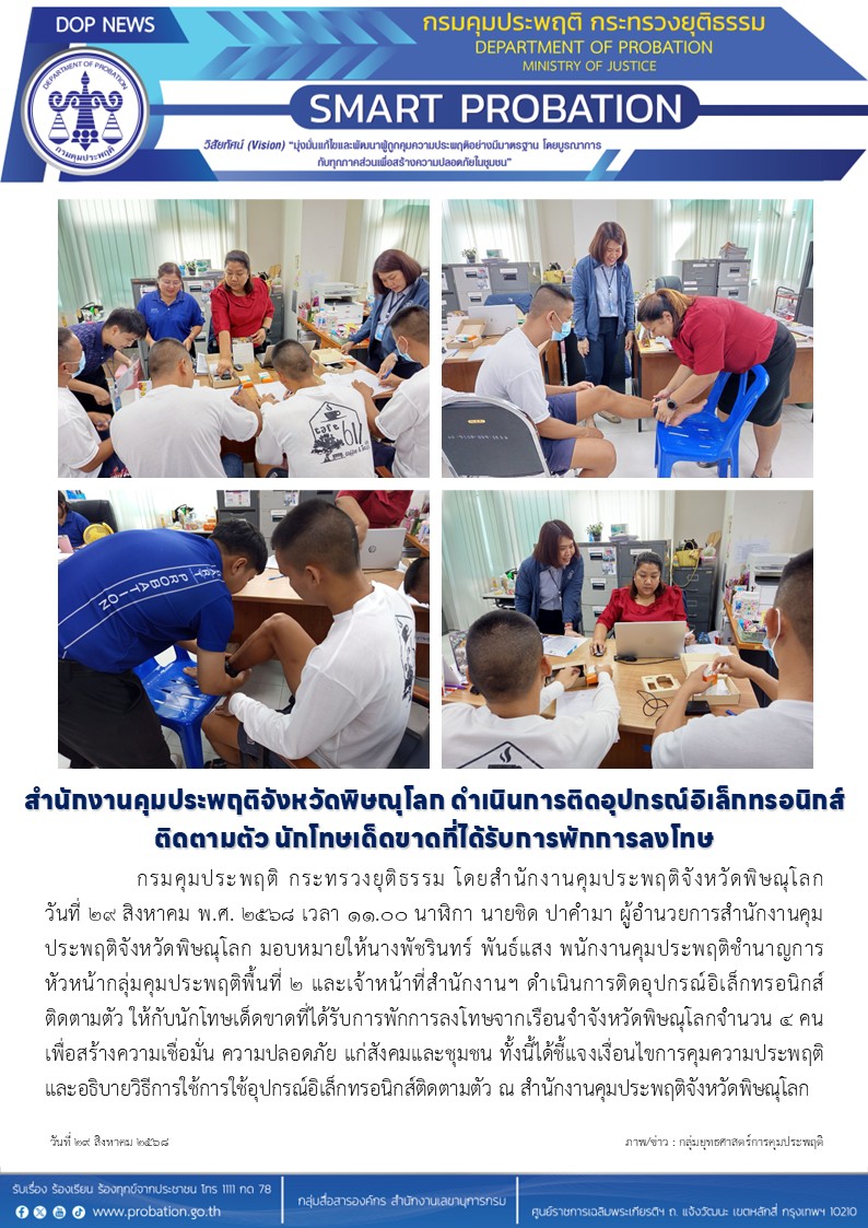 กรมคุมประพฤติ กระทรวงยุติธรรม โดยสำนักงานคุมประพฤติจังหวัดพิษณุโลก วันที่ 29 สิงหาคม พ.ศ. 2568 เวลา 11.00 นาฬิกา นายชิด ปาคำมา ผู้อำนวยการสำนักงานคุมประพฤติจังหวัดพิษณุโลก มอบหมายให้นางพัชรินทร์ พันธ์แสง พนักงานคุมประพฤติชำนาญการ หัวหน้ากลุ่มคุมประพฤติพื้นที่ 2 และเจ้าหน้าที่สำนักงานฯ ดำเนินการติดอุปกรณ์อิเล็กทรอนิกส์ติดตามตัว ให้กับนักโทษเด็ดขาดที่ได้รับการพักการลงโทษจากเรือนจำจังหวัดพิษณุโลกจำนวน 4 คน เพื่อสร้างความเชื่อมั่น ความปลอดภัย แก่สังคมและชุมชน ทั้งนี้ได้ชี้แจงเงื่อนไขการคุมความประพฤติ และอธิบายวิธีการใช้การใช้อุปกรณ์อิเล็กทรอนิกส์ติดตามตัว ณ สำนักงานคุมประพฤติจังหวัดพิษณุโลก