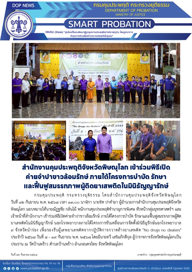 กรมคุมประพฤติ กระทรวงยุติธรรม โดยสำนักงานคุมประพฤติจังหวัดพิษณุโลก วันที่ 12 กันยายน พ.ศ. 2568 เวลา 13.00 นาฬิกา นายชิด ปาคำมา ผู้อำนวยการสำนักงานคุมประพฤติจังหวัดพิษณุโลก มอบหมายให้นายณัฏฐชัย กลิ่นไม้ พนักงานคุมประพฤติชำนาญการพิเศษ หัวหน้ากลุ่มยุทธศาสตร์ฯ และเจ้าหน้าที่สำนักงานฯ เข้าร่วมพิธีเปิดค่ายจำปาขาวล้อมรักษ์ ภายใต้โครงการบำบัด รักษาและฟื้นฟูสมรรกภาพผู้ติดยาเสพติดในมินิธัญญารักษ์ นอกโรงพยาบาลภายใต้โครงการขับเคลื่อนการจัดตั้งมินิธัญรักษ์นอกโรงพยาบาล 9 จังหวัดนำร่อง เพื่อรองรับผู้เสพยาเสพติดจากปฏิบัติการกวาดล้างยาเสพติด "No drugs no dealers" ประจำปี 2568 วันที่ 8 - 19 กันยายน พ.ศ. 2568 โดยมีนายทวี เสริมภักดีกุล ผู้ว่าราชการจังหวัดพิษณุโลกเป็นประธาน ณ วัดบ้านพร้าว ตำบลบ้านพร้าว อำเภอนครไทย จังหวัดพิษณุโลก