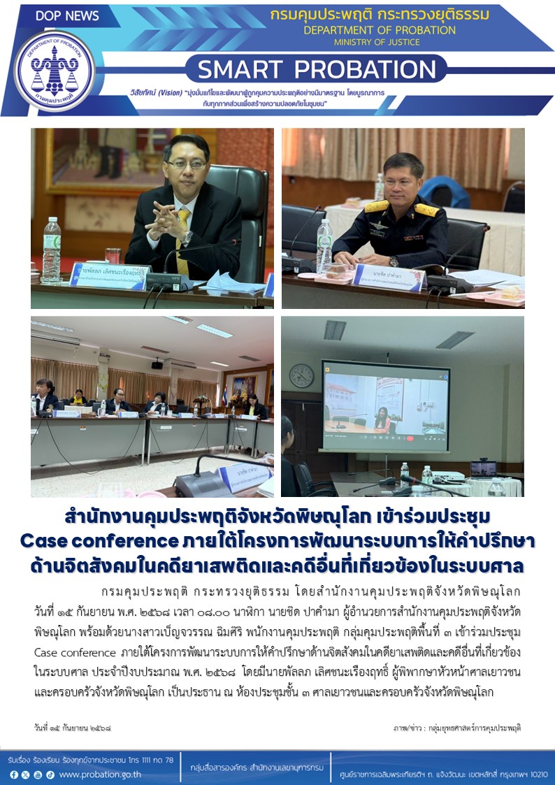 กรมคุมประพฤติ กระทรวงยุติธรรม โดยสำนักงานคุมประพฤติจังหวัดพิษณุโลก วันที่ 15 กันยายน พ.ศ. 2568 เวลา 08.00 นาฬิกา นายชิด ปาคำมา ผู้อำนวยการสำนักงานคุมประพฤติจังหวัดพิษณุโลก พร้อมด้วยนางสาวเบ็ญจวรรณ ฉิมศิริ พนักงานคุมประพฤติ กลุ่มคุมประพฤติพื้นที่ 3 เข้าร่วมประชุม Case conference ภายใต้โครงการพัฒนาระบบการให้คำปรึกษาด้านจิตสังคมในคดียาเสพติดและคดีอื่นที่เกี่ยวข้องในระบบศาล ประจำปีงบประมาณ พ.ศ. 2568 โดยมีนายพัลลภ เลิศชนะเรืองฤทธิ์ ผู้พิพากษาหัวหน้าศาลเยาวชนและครอบครัวจังหวัดพิษณุโลก เป็นประธาน ณ ห้องประชุมชั้น 3 ศาลเยาวชนและครอบครัวจังหวัดพิษณุโลก.jpg)