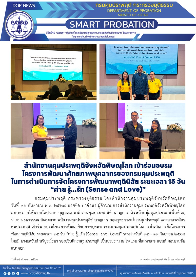 กรมคุมประพฤติ กระทรวงยุติธรรม โดยสำนักงานคุมประพฤติจังหวัดพิษณุโลก วันที่ 15 กันยายน พ.ศ. 2568 นายชิด ปาคำมา ผู้อำนวยการสำนักงานคุมประพฤติจังหวัดพิษณุโลก มอบหมายให้นายกัมปนาท บุญผสม พนักงานคุมประพฤติชำนาญการ หัวหน้ากลุ่มคุมประพฤติพื้นที่ 3, นางสาวธนาวรรณ อินสะอาด พนักงานคุมประพฤติชำนาญการ กลุ่มยุทธศาสตร์การคุมประพฤติ และอาสาสมัครคุมประพฤติ เข้าร่วมอบรมโครงการพัฒนาศักยภาพบุคลากรของกรมคุมประพฤติ ในการดำเนินการจัดโครงการพัฒนาพฤตินิสัย ระยะเวลา 15 วัน "ค่าย รู้...รัก (Sense and Love)" ระหว่างวันที่ 15 - 19 กันยายน 2568 โดยมี นางยศวันต์ บริบูรณ์ธนา รองอธิบดีกรมคุมประพฤติ เป็นประธาน ณ โรงแรม ทีเค.พาเลซ แอนด์ คอนเวนชั่น แบงคอก.jpg)