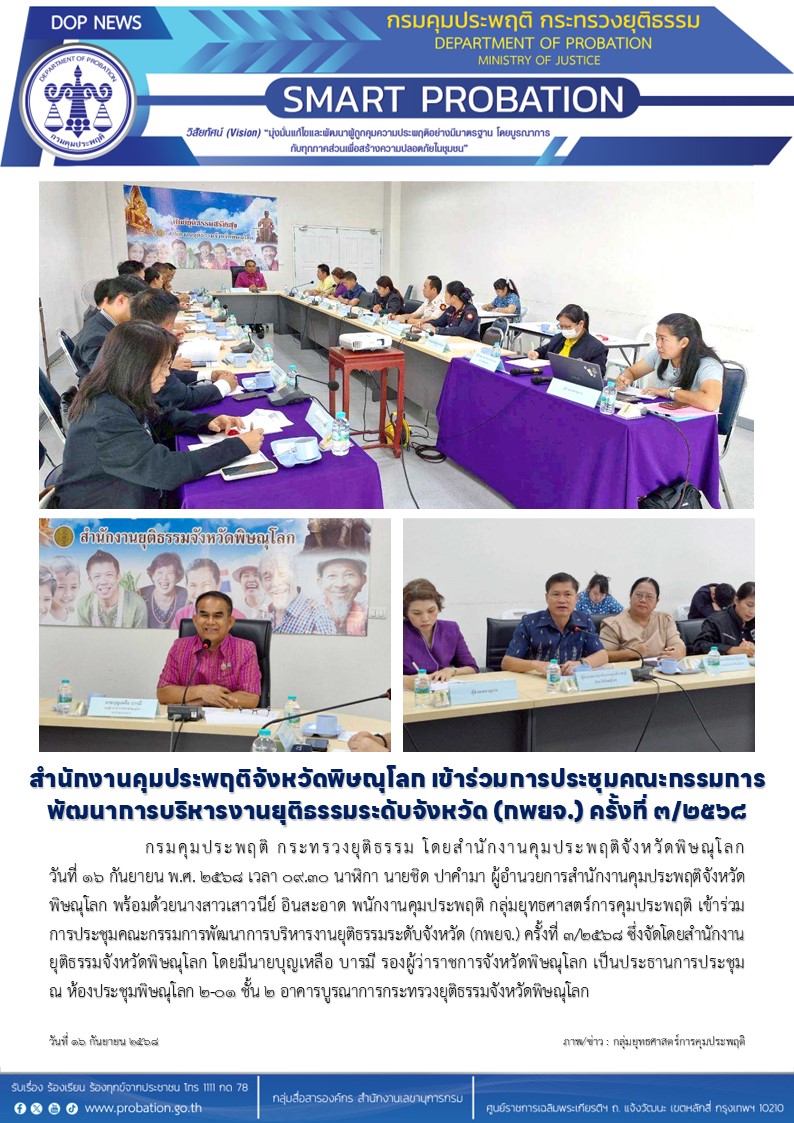 กรมคุมประพฤติ กระทรวงยุติธรรม โดยสำนักงานคุมประพฤติจังหวัดพิษณุโลก วันที่ 16 กันยายน พ.ศ. 2568 เวลา 09.30 นาฬิกา นายชิด ปาคำมา ผู้อำนวยการสำนักงานคุมประพฤติจังหวัดพิษณุโลก พร้อมด้วยนางสาวเสาวนีย์ อินสะอาด พนักงานคุมประพฤติ กลุ่มยุทธศาสตร์การคุมประพฤติ เข้าร่วมการประชุมคณะกรรมการพัฒนาการบริหารงานยุติธรรมระดับจังหวัด (กพยจ.) ครั้งที่ 3/2568 ซึ่งจัดโดยสำนักงานยุติธรรมจังหวัดพิษณุโลก โดยมีนายบุญเหลือ บารมี รองผู้ว่าราชการจังหวัดพิษณุโลก เป็นประธานการประชุม ณ ห้องประชุมพิษณุโลก 2-01 ชั้น 2 อาคารบูรณาการกระทรวงยุติธรรมจังหวัดพิษณุโลก.jpg)