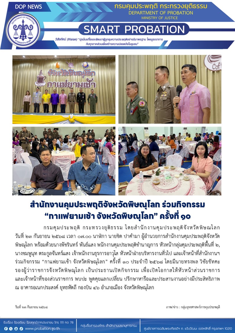 กรมคุมประพฤติ กระทรวงยุติธรรม โดยสำนักงานคุมประพฤติจังหวัดพิษณโลก วันที่ 23 กันยายน 2568 เวลา 07.00 นาฬิกา นายชิด ปาคำมา ผู้อำนวยการสำนักงานคุมประพฤติจังหวัดพิษณุโลก พร้อมด้วยนางพัชรินทร์ พันธ์แสง พนักงานคุมประพฤติชำนาญการ หัวหน้ากลุ่มคุมประพฤติพื้นที่ 2, นางชมพูนุท ตระกูลจันทร์แสง เจ้าพนักงานธุรการอาวุโส หัวหน้าฝ่ายบริหารงานทั่วไป และเจ้าหน้าที่สำนักงานฯ ร่วมกิจกรรม "กาแฟยามเช้า จังหวัดพิษณุโลก" ครั้งที่ 10 ประจำปี 2568 โดยมีนายทรงพล วิชัยขัทคะ รองผู้ว่าราชการจังหวัดพิษณุโลก เป็นประธานเปิดกิจกรรม เพื่อเปิดโอกาสให้หัวหน้าส่วนราชการ และเจ้าหน้าที่ของส่วนราชการ พบปะ พูดคุยแลกเปลี่ยน ปรึกษาหารือและประสานงานอย่างมีประสิทธิภาพ ณ อาคารอเนกประสงค์ ยุทธหัตถี กองบิน 46 อำเภอเมือง จังหวัดพิษณุโลก