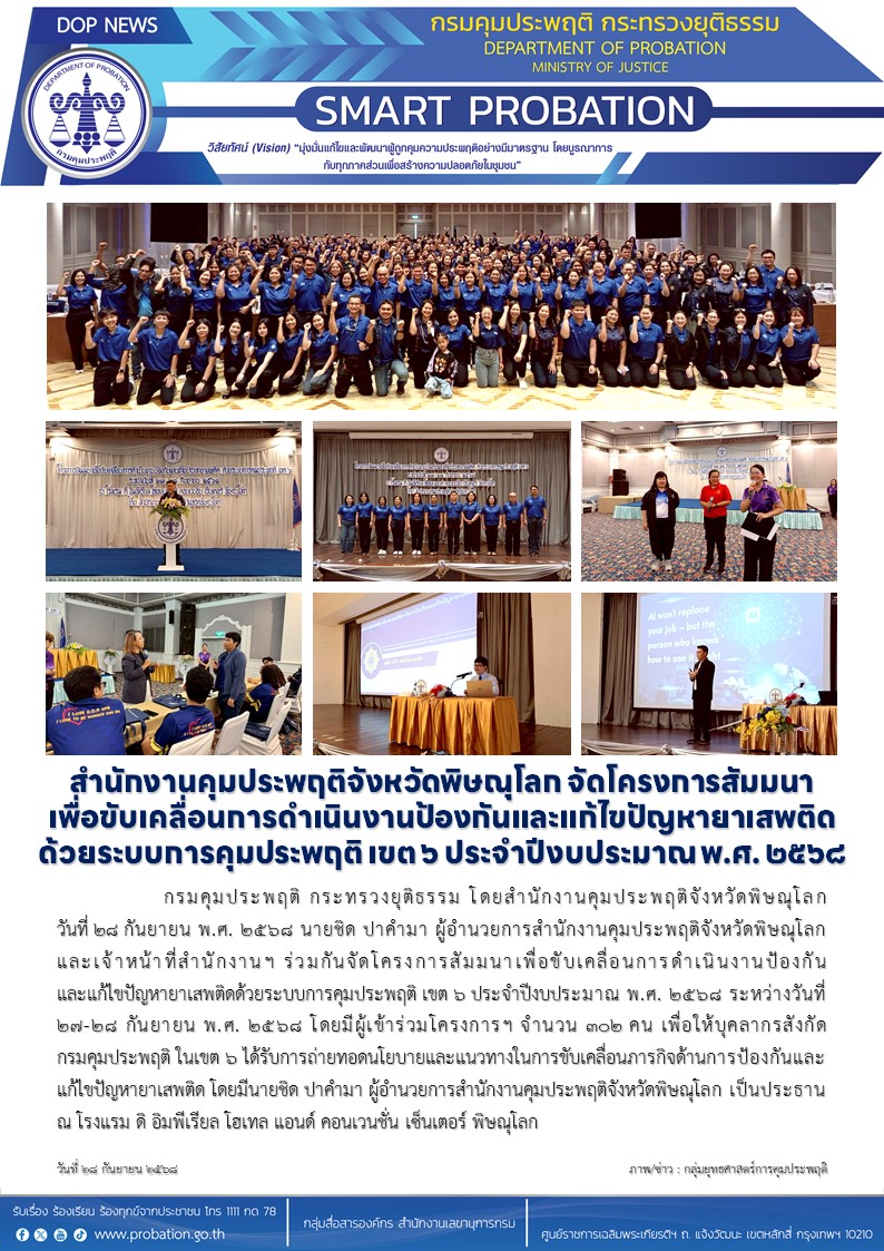 กรมคุมประพฤติ กระทรวงยุติธรรม โดยสำนักงานคุมประพฤติจังหวัดพิษณุโลก วันที่ 28 กันยายน พ.ศ. 2568 นายชิด ปาคำมา ผู้อำนวยการสำนักงานคุมประพฤติจังหวัดพิษณุโลก และเจ้าหน้าที่สำนักงานฯ ร่วมกันจัดโครงการสัมมนาเพื่อขับเคลื่อนการดำเนินงานป้องกัน และแก้ไขปัญหายาเสพติดด้วยระบบการคุมประพฤติ เขต 6 ประจำปีงบประมาณ พ.ศ. 2568 ระหว่างวันที่ 27-28 กันยายน พ.ศ. 2568 โดยมีผู้เข้าร่วมโครงการฯ จำนวน 302 คน เพื่อให้บุคลากรสังกัดกรมคุมประพฤติ ในเขต 6 ได้รับการถ่ายทอดนโยบายและแนวทางในการขับเคลื่อนภารกิจด้านการป้องกันและแก้ไขปัญหายาเสพติด โดยมีนายชิด ปาคำมา ผู้อำนวยการสำนักงานคุมประพฤติจังหวัดพิษณุโลก เป็นประธาน ณ โรงแรม ดิ อิมพีเรียล โฮเทล แอนด์ คอนเวนชั่น เซ็นเตอร์ พิษณุโลก