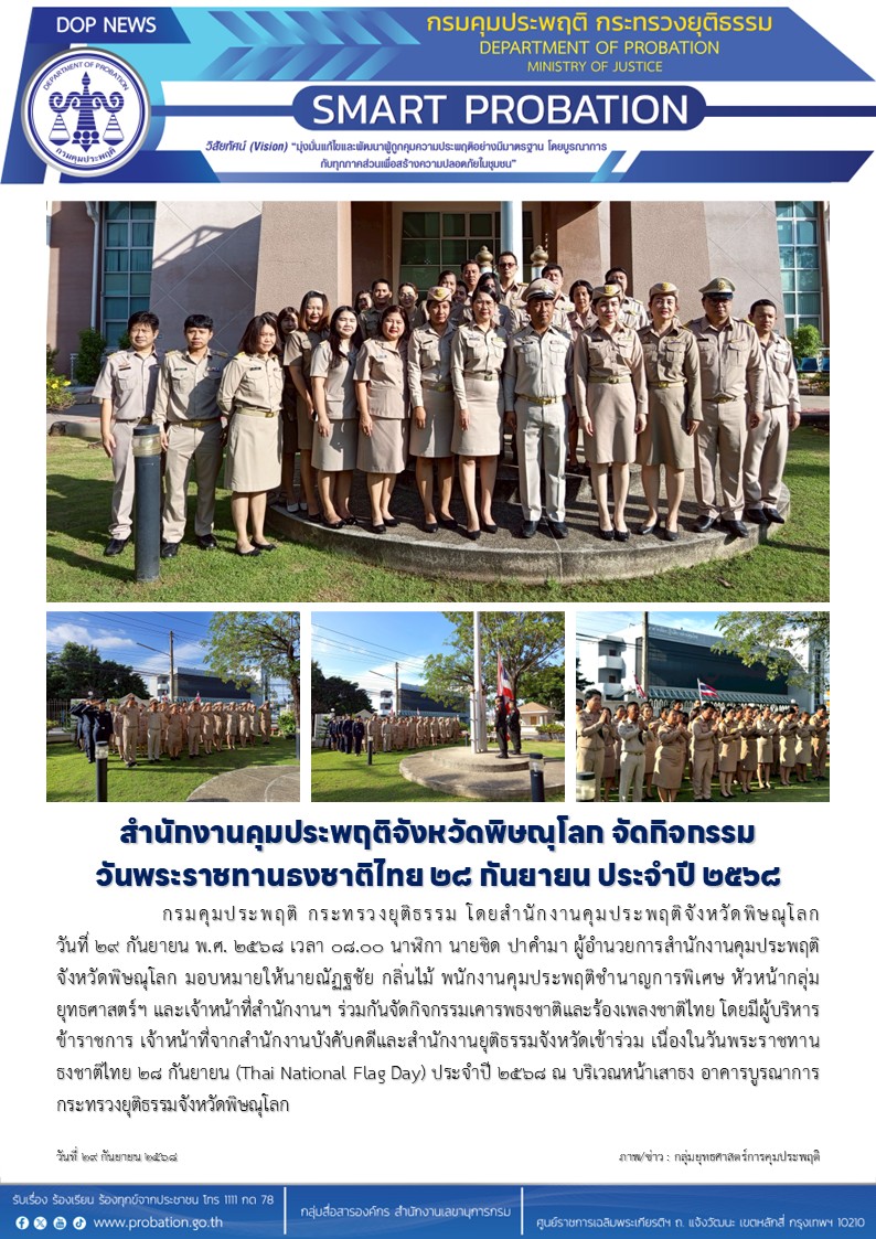 กรมคุมประพฤติ กระทรวงยุติธรรม โดยสำนักงานคุมประพฤติจังหวัดพิษณุโลก วันที่ 29 กันยายน พ.ศ. 2568 เวลา 08.00 นาฬิกา นายชิด ปาคำมา ผู้อำนวยการสำนักงานคุมประพฤติจังหวัดพิษณุโลก มอบหมายให้นายณัฏฐชัย กลิ่นไม้ พนักงานคุมประพฤติชำนาญการพิเศษ หัวหน้ากลุ่มยุทธศาสตร์ฯ และเจ้าหน้าที่สำนักงานฯ ร่วมกันจัดกิจกรรมเคารพธงชาติและร้องเพลงชาติไทย โดยมีผู้บริหาร ข้าราชการ เจ้าหน้าที่จากสำนักงานบังคับคดีและสำนักงานยุติธรรมจังหวัดเข้าร่วม เนื่องในวันพระราชทานธงชาติไทย 28 กันยายน (Thai National Flag Day) ประจำปี 2568 ณ บริเวณหน้าเสาธง อาคารบูรณาการกระทรวงยุติธรรมจังหวัดพิษณุโลก