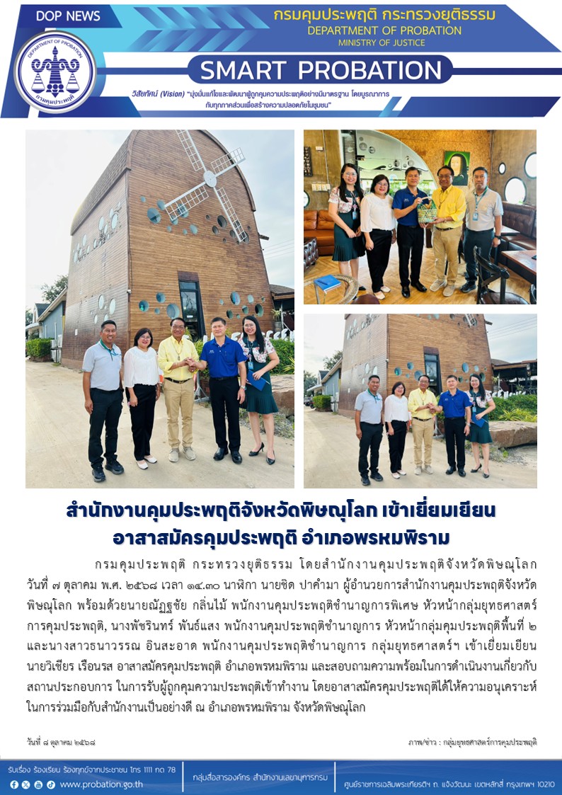 กรมคุมประพฤติ กระทรวงยุติธรรม โดยสำนักงานคุมประพฤติจังหวัดพิษณุโลก วันที่ 7 ตุลาคม พ.ศ. 2568 เวลา 14.30 นาฬิกา นายชิด ปาคำมา ผู้อำนวยการสำนักงานคุมประพฤติจังหวัดพิษณุโลก พร้อมด้วยนายณัฏฐชัย กลิ่นไม้ พนักงานคุมประพฤติชำนาญการพิเศษ หัวหน้ากลุ่มยุทธศาสตร์การคุมประพฤติ, นางพัชรินทร์ พันธ์แสง พนักงานคุมประพฤติชำนาญการ หัวหน้ากลุ่มคุมประพฤติพื้นที่ 2 และนางสาวธนาวรรณ อินสะอาด พนักงานคุมประพฤติชำนาญการ กลุ่มยุทธศาสตร์ฯ เข้าเยี่ยมเยียน นายวิเชียร เรือนรส อาสาสมัครคุมประพฤติ อำเภอพรหมพิราม และสอบถามความพร้อมในการดำเนินงานเกี่ยวกับสถานประกอบการ ในการรับผู้ถูกคุมความประพฤติเข้าทำงาน โดยอาสาสมัครคุมประพฤติได้ให้ความอนุเคราะห์ ในการร่วมมือกับสำนักงานเป็นอย่างดี ณ อำเภอพรหมพิราม จังหวัดพิษณุโลก