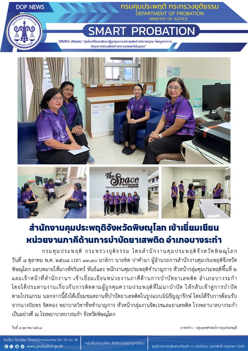 กรมคุมประพฤติ กระทรวงยุติธรรม โดยสำนักงานคุมประพฤติจังหวัดพิษณุโลก วันที่ 8 ตุลาคม พ.ศ. 2568 เวลา 13.30 นาฬิกา นายชิด ปาคำมา ผู้อำนวยการสำนักงานคุมประพฤติจังหวัดพิษณุโลก มอบหมายให้นางพัชรินทร์ พันธ์แสง พนักงานคุมประพฤติชำนาญการ หัวหน้ากลุ่มคุมประพฤติพื้นที่ 2 และเจ้าหน้าที่สำนักงานฯ เข้าเยี่ยมเยียนหน่วยงานภาคีด้านการบำบัดยาเสพติด อำเภอบางระกำ โดยได้ประสานงานเกี่ยวกับการติดตามผู้ถูกคุมความประพฤติที่ไม่มาบำบัด ให้กลับเข้าสู่การบำบัดตามโปรแกรม นอกจากนี้ยังได้เยี่ยมชมสถานที่บำบัดยาเสพติดในรูปแบบมินิธัญญารักษ์ โดยได้รับการต้อนรับจากนางปิยพร จิตทอง พยาบาลวิชาชีพชำนาญการ หัวหน้ากลุ่มงานจิตเวชและยาเสพติด โรงพยาบาลบางระกำ เป็นอย่างดี ณ โรงพยาบาลบางระกำ จังหวัดพิษณุโลก