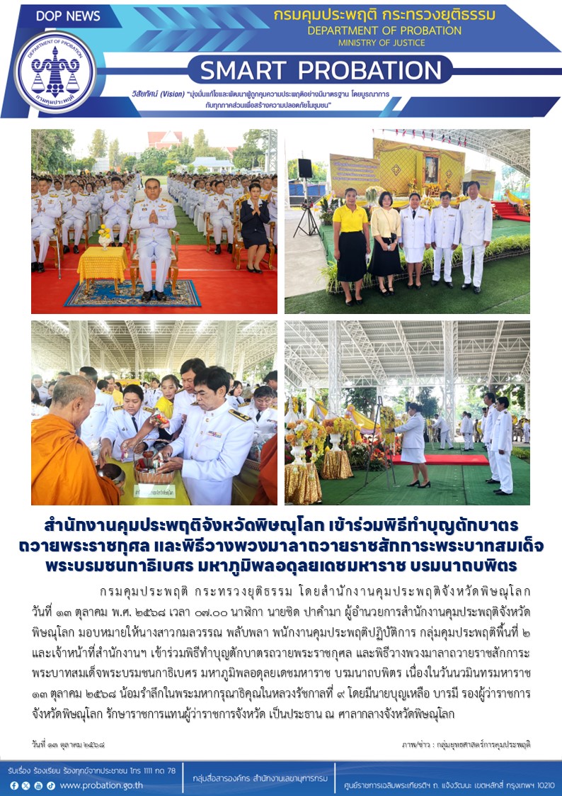 กรมคุมประพฤติ กระทรวงยุติธรรม โดยสำนักงานคุมประพฤติจังหวัดพิษณุโลก วันที่ 13 ตุลาคม พ.ศ. 2568 เวลา 07.00 นาฬิกา นายชิด ปาคำมา ผู้อำนวยการสำนักงานคุมประพฤติจังหวัดพิษณุโลก มอบหมายให้นางสาวกมลวรรณ พลับพลา พนักงานคุมประพฤติปฏิบัติการ กลุ่มคุมประพฤติพื้นที่ 2 และเจ้าหน้าที่สำนักงานฯ เข้าร่วมพิธีทำบุญตักบาตรถวายพระราชกุศล และพิธีวางพวงมาลาถวายราชสักการะพระบาทสมเด็จพระบรมชนกาธิเบศร มหาภูมิพลอดุลยเดชมหาราช บรมนาถบพิตร เนื่องในวันนวมินทรมหาราช 13 ตุลาคม 2568 น้อมรำลึกในพระมหากรุณาธิคุณในหลวงรัชกาลที่ 9 โดยมีนายบุญเหลือ บารมี รองผู้ว่าราชการจังหวัดพิษณุโลก รักษาราชการแทนผู้ว่าราชการจังหวัด เป็นประธาน ณ ศาลากลางจังหวัดพิษณุโลก