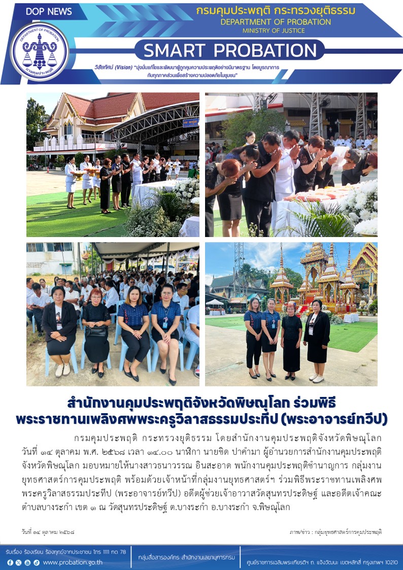 กรมคุมประพฤติ กระทรวงยุติธรรม โดยสำนักงานคุมประพฤติจังหวัดพิษณุโลก วันที่ 14 ตุลาคม พ.ศ. 2568 เวลา 14.00 นาฬิกา นายชิด ปาคำมา ผู้อำนวยการสำนักงานคุมประพฤติจังหวัดพิษณุโลก มอบหมายให้นางสาวธนาวรรณ อินสะอาด พนักงานคุมประพฤติชำนาญการ กลุ่มงานยุทธศาสตร์การคุมประพฤติ พร้อมด้วยเจ้าหน้าที่กลุ่มงานยุทธศาสตร์ฯ ร่วมพิธีพระราชทานเพลิงศพพระครูวิลาสธรรมประทีป (พระอาจารย์ทวีป) อดีตผู้ช่วยเจ้าอาวาสวัดสุนทรประดิษฐ์ และอดีตเจ้าคณะตำบลบางระกำ เขต 1 ณ วัดสุนทรประดิษฐ์ ต.บางระกำ อ.บางระกํา จ.พิษณุโลก