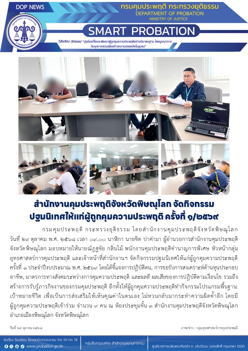 กรมคุมประพฤติ กระทรวงยุติธรรม โดยสำนักงานคุมประพฤติจังหวัดพิษณุโลก วันที่ 29 ตุลาคม พ.ศ. 2568 เวลา 09.00 นาฬิกา นายชิด ปาคำมา ผู้อำนวยการสำนักงานคุมประพฤติจังหวัดพิษณุโลก มอบหมายให้นายณัฏฐชัย กลิ่นไม้ พนักงานคุมประพฤติชำนาญการพิเศษ หัวหน้ากลุ่มยุทธศาสตร์การคุมประพฤติ และเจ้าหน้าที่สำนักงานฯ จัดกิจกรรมปฐมนิเทศให้แก่ผู้ถูกคุมความประพฤติ ครั้งที่ 1 ประจำปีงบประมาณ พ.ศ. 2569 โดยได้ชี้แจงการปฏิบัติตน, การขอรับการสงเคราะห์ด้านทุนประกอบอาชีพ, มาตรการทางสังคมระหว่างการคุมความประพฤติ และผลดี ผลเสียของการปฏิบัติตามเงื่อนไข รวมถึงสร้างการรับรู้ภารกิจงานของกรมคุมประพฤติ อีกทั้งให้ผู้ถูกคุมความประพฤติทำกิจกรรมโปรแกรมพื้นฐาน: เป้าหมายชีวิต เพื่อเป็นการส่งเสริมให้เห็นคุณค่าในตนเอง ไม่หวนกลับมากระทำความผิดซ้ำอีก โดยมีผู้ถูกคุมความประพฤติเข้าร่วม จำนวน 9 คน ณ ห้องประชุมชั้น 3 สำนักงานคุมประพฤติจังหวัดพิษณุโลก อำเภอเมืองพิษณุโลก จังหวัดพิษณุโลก