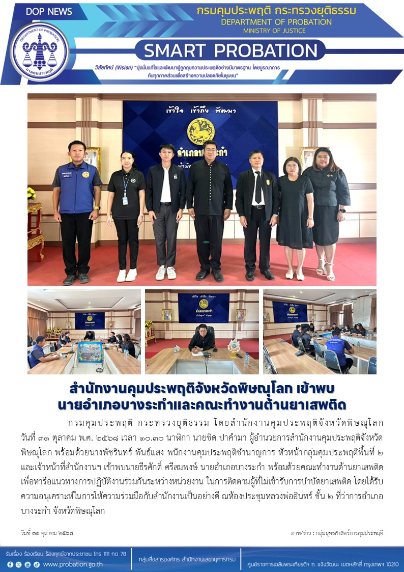 กรมคุมประพฤติ กระทรวงยุติธรรม โดยสำนักงานคุมประพฤติจังหวัดพิษณุโลก วันที่ 31 ตุลาคม พ.ศ. 2568 เวลา 10.30 นาฬิกา นายชิด ปาคำมา ผู้อำนวยการสำนักงานคุมประพฤติจังหวัดพิษณุโลก พร้อมด้วยนางพัชรินทร์ พันธ์แสง พนักงานคุมประพฤติชำนาญการ หัวหน้ากลุ่มคุมประพฤติพื้นที่ 2 และเจ้าหน้าที่สำนักงานฯ เข้าพบนายธีรศักดิ์ ศรีสมพงษ์ นายอำเภอบางระกำ พร้อมด้วยคณะทำงานต้านยาเสพติด เพื่อหารือแนวทางการปฏิบัติงานร่วมกันระหว่างหน่วยงาน ในการติดตามผู้ที่ไม่เข้ารับการบำบัดยาเสพติด โดยได้รับความอนุเคราะห์ในการให้ความร่วมมือกับสำนักงานเป็นอย่างดี ณห้องประชุมหลวงพ่ออินทร์ ชั้น 2 ที่ว่าการอำเภอบางระกำ จังหวัดพิษณุโลก