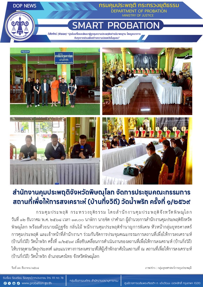 กรมคุมประพฤติ กระทรวงยุติธรรม โดยสำนักงานคุมประพฤติจังหวัดพิษณุโลก วันที่ 12 ธันวาคม พ.ศ. 2568 เวลา 13.00 นาฬิกา นายชิด ปาคำมา ผู้อำนวยการสำนักงานคุมประพฤติจังหวัดพิษณุโลก พร้อมด้วยนายณัฏฐชัย กลิ่นไม้ พนักงานคุมประพฤติชำนาญการพิเศษ หัวหน้ากลุ่มยุทธศาสตร์การคุมประพฤติ และเจ้าหน้าที่สำนักงานฯ ร่วมกันจัดการประชุมคณะกรรมการสถานที่เพื่อให้การสงเคราะห์ (บ้านกึ่งวิถี) วัดน้ำพริก ครั้งที่ 1/2569 เพื่อขับเคลื่อนการดำเนินงานของสถานที่เพื่อให้การสงเคราะห์ (บ้านกึ่งวิถี) ให้บรรลุตามวัตถุประสงค์ และแนวทางการสงเคราะห์ให้ผู้เข้าพักอาศัยในสถานที่ ณ สถานที่เพื่อให้การสงเคราะห์ (บ้านกึ่งวิถี) วัดน้ำพริก อำเภอนครไทย จังหวัดพิษณุโลก