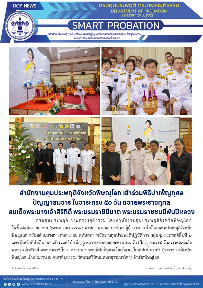 กรมคุมประพฤติ กระทรวงยุติธรรม โดยสำนักงานคุมประพฤติจังหวัดพิษณุโลก วันที่ 12 ธันวาคม พ.ศ. 2568 เวลา 18.30 นาฬิกา นายชิด ปาคำมา ผู้อำนวยการสำนักงานคุมประพฤติจังหวัดพิษณุโลก พร้อมด้วยนางสาวกมลวรรณ พลับพลา พนักงานคุมประพฤติปฏิบัติการ กลุ่มคุมประพฤติพื้นที่ 2 และเจ้าหน้าที่สำนักงานฯ เข้าร่วมพิธีบำเพ็ญกุศลถวายพระราชกุศลครบ 50 วัน (ปัญญาสมวาร) วันสวรรคตสมเด็จพระนางเจ้าสิริกิติ์ พระบรมราชินีนาถ พระบรมราชชนนีพันปีหลวง โดยมีนายเกียรติศักดิ์ ตรงศิริ ผู้ว่าราชการจังหวัดพิษณุโลก เป็นประธาน ณ ศาลาพิบูลธรรม วัดพระศรีรัตนมหาธาตุวรมหาวิหาร จังหวัดพิษณุโลก