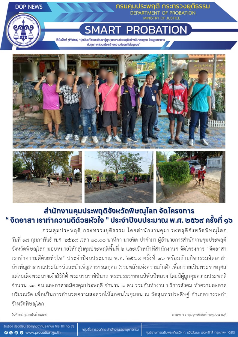 กรมคุมประพฤติ กระทรวงยุติธรรม โดยสำนักงานคุมประพฤติจังหวัดพิษณุโลก วันที่ 18 กุมภาพันธ์ พ.ศ. 2569 เวลา 10.00 นาฬิกา นายชิด ปาคำมา ผู้อำนวยการสำนักงานคุมประพฤติจังหวัดพิษณุโลก มอบหมายให้กลุ่มคุมประพฤติพื้นที่ 2 และเจ้าหน้าที่สำนักงานฯ จัดโครงการ "จิตอาสา เราทำความดีด้วยหัวใจ" ประจำปีงบประมาณ พ.ศ. 2569 ครั้งที่ 16 พร้อมด้วยกิจกรรมจิตอาสาบำเพ็ญสาธารณประโยชน์และบำเพ็ญสาธารณกุศล (รวมพลังแห่งความภักดี) เพื่อถวายเป็นพระราชกุศล แด่สมเด็จพระนางเจ้าสิริกิติ์ พระบรมราชินีนาถ พระบรมราชชนนีพันปีหลวง โดยมีผู้ถูกคุมความประพฤติ จำนวน 13 คน และอาสาสมัครคุมประพฤติ จำนวน 1 คน ร่วมกันทำงาน บริการสังคม ทำความสะอาดบริเวณวัด เพื่อเป็นการอำนวยความสะดวกให้แก่คนในชุมชน ณ วัดสุนทรประดิษฐ์ อำเภอบางระกำ จังหวัดพิษณุโลก