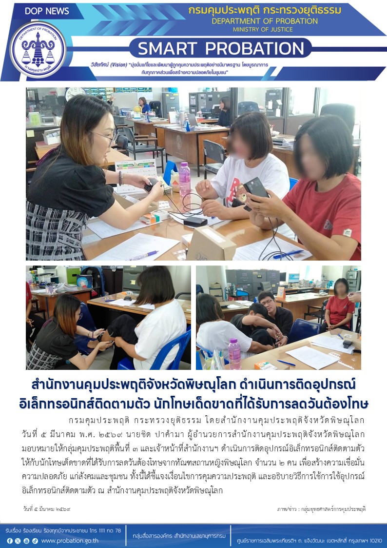 กรมคุมประพฤติ กระทรวงยุติธรรม โดยสำนักงานคุมประพฤติจังหวัดพิษณุโลก วันที่ 5 มีนาคม พ.ศ. 2569 นายชิด ปาคำมา ผู้อำนวยการสำนักงานคุมประพฤติจังหวัดพิษณุโลก มอบหมายให้กลุ่มคุมประพฤติพื้นที่ 3 และเจ้าหน้าที่สำนักงานฯ ดำเนินการติดอุปกรณ์อิเล็กทรอนิกส์ติดตามตัว ให้กับนักโทษเด็ดขาดที่ได้รับการลดวันต้องโทษจากทัณฑสถานหญิงพิษณุโลก จำนวน 2 คน เพื่อสร้างความเชื่อมั่น ความปลอดภัย แก่สังคมและชุมชน ทั้งนี้ได้ชี้แจงเงื่อนไขการคุมความประพฤติ และอธิบายวิธีการใช้การใช้อุปกรณ์อิเล็กทรอนิกส์ติดตามตัว ณ สำนักงานคุมประพฤติจังหวัดพิษณุโลก