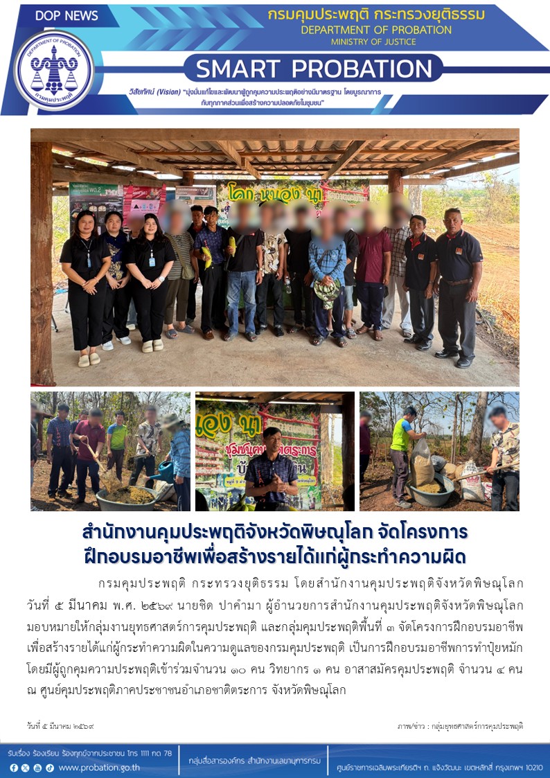 กรมคุมประพฤติ กระทรวงยุติธรรม โดยสำนักงานคุมประพฤติจังหวัดพิษณุโลก วันที่ 5 มีนาคม พ.ศ. 2569 นายชิด ปาคำมา ผู้อำนวยการสำนักงานคุมประพฤติจังหวัดพิษณุโลก มอบหมายให้กลุ่มงานยุทธศาสตร์การคุมประพฤติ และกลุ่มคุมประพฤติพื้นที่ 3 จัดโครงการฝึกอบรมอาชีพ เพื่อสร้างรายได้แก่ผู้กระทำความผิดในความดูแลของกรมคุมประพฤติ เป็นการฝึกอบรมอาชีพการทำปุ๋ยหมักโดยมีผู้ถูกคุมความประพฤติเข้าร่วมจำนวน 10 คน วิทยากร 1 คน อาสาสมัครคุมประพฤติ จำนวน 4 คน ณ ศูนย์คุมประพฤติภาคประชาชนอำเภอชาติตระการ จังหวัดพิษณุโลก